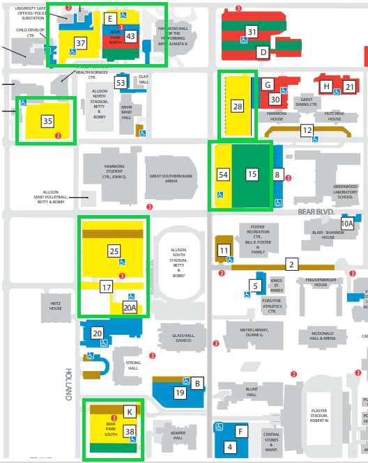 - Commencement parking is available in lots 15, 17, 20A, 25, 28, 35, 37, 38 (Bear Park South), 43 (Bear Park North), and 54.