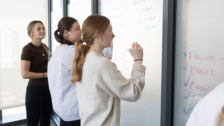 Nursing students taking notes on a dry erase board in Ann Kampeter Health Sciences Hall.