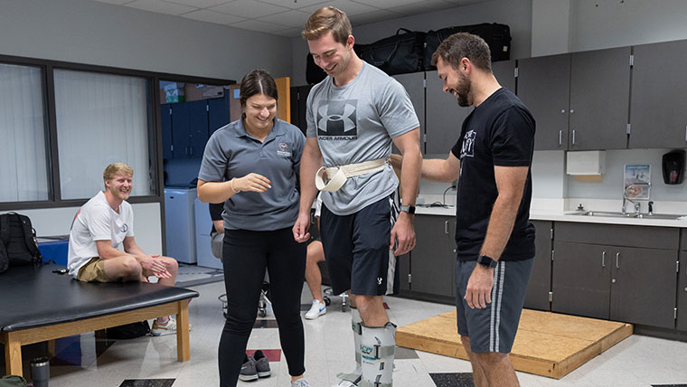 Two physical therapy students helping another student walk around in prosthetic footwear.
