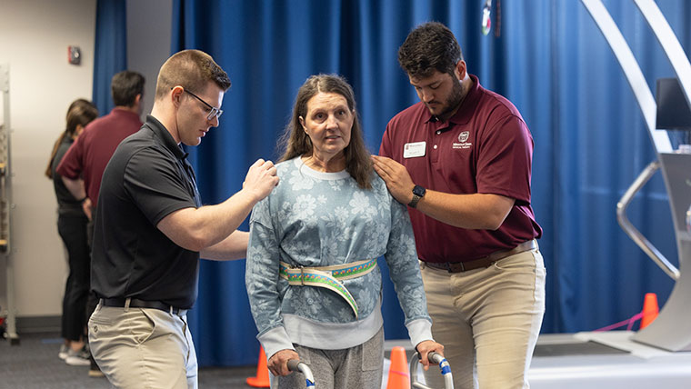Two physical therapy students assisting a client using a walker at the PT Clinic.