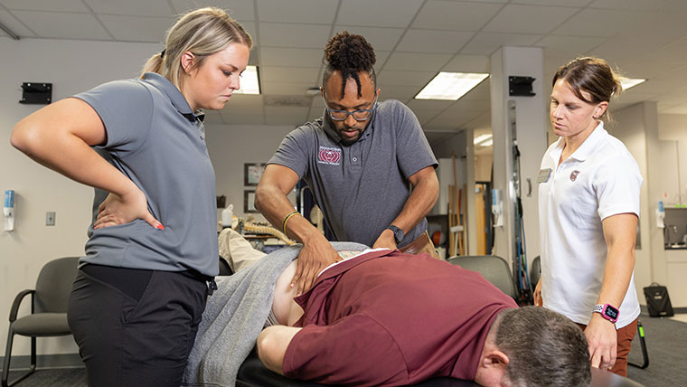 Two physical therapy students and a professor going over spine care techniques on a patient.